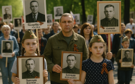Дети исполняют песню памяти, посвящённую павшим героям разных войн. Их голоса звучат искренне и трогательно, а за спинами — портреты неизвестных солдат, погибших на полях сражений. Песня не о конкретной войне, а о самой теме жертвы и памяти. Это момент единства, благодарности и уважения. Дети выражают то, что взрослые часто не могут сказать словами: светлую скорбь и признательность тем, кто отдал жизнь ради будущего.